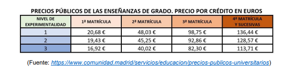 Por ello, en esta ocasión, queremos resaltar especialmente la enmienda relativa a la creación de una partida presupuestaria en educación por un importe de 120.000 €, destinada a becas para matriculas de estudios de Formación Profesional y Universitaria, para que alumnos y alumnas de familias vulnerables económicamente puedan acceder a estos estudios en centros públicos. En primer lugar, queremos dar a conocer el precio de las enseñanzas de grado en nuestra Comunidad, que dependen de dos factores: número de veces en que el estudiante se matricule en el mismo curso y grado de “experimentalidad” de los estudios elegidos.